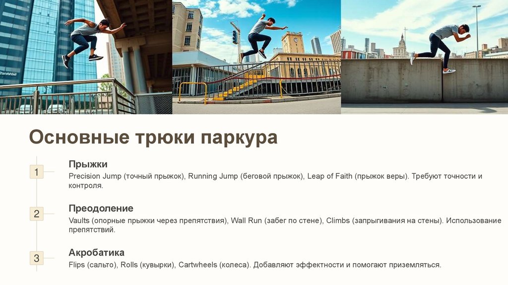 Flips (сальто), Rolls (кувырки), Cartwheels (колеса). Добавляют эффектности и помогают приземляться.