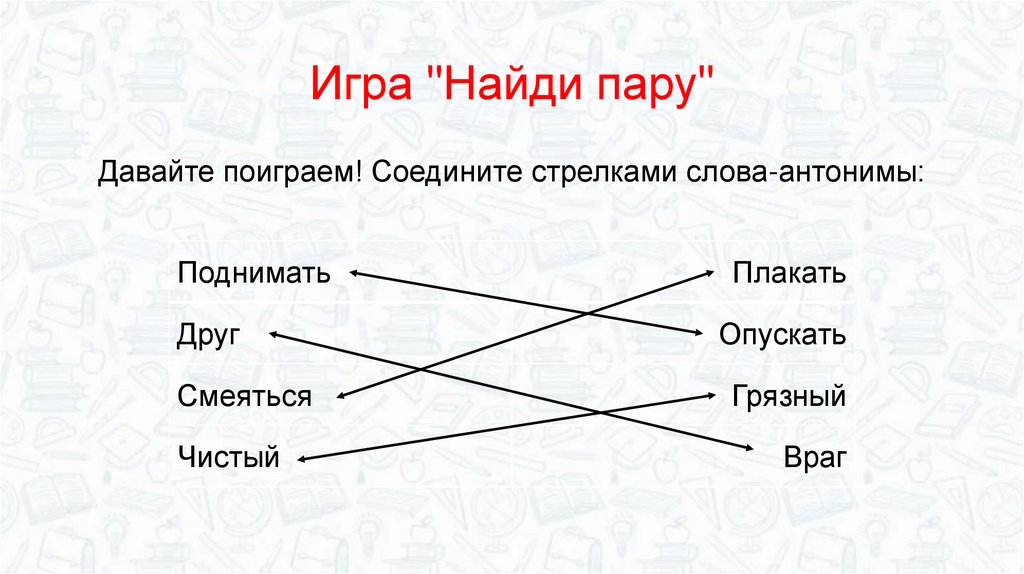 Игра "Найди пару"Давайте поиграем! Соедините стрелками слова-антонимы: