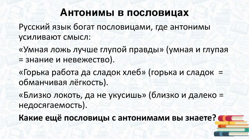 Русский язык богат пословицами, где антонимыусиливают смысл: