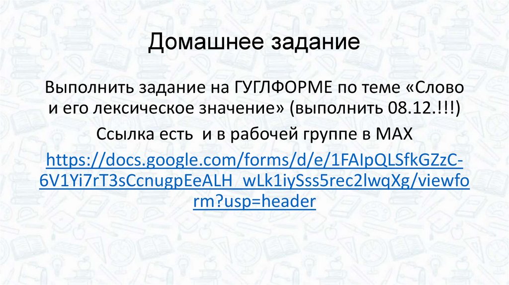 Выполнить задание на ГУГЛФОРМЕ по теме «Словои его лексическое значение» (выполнить 08.12.!!!)