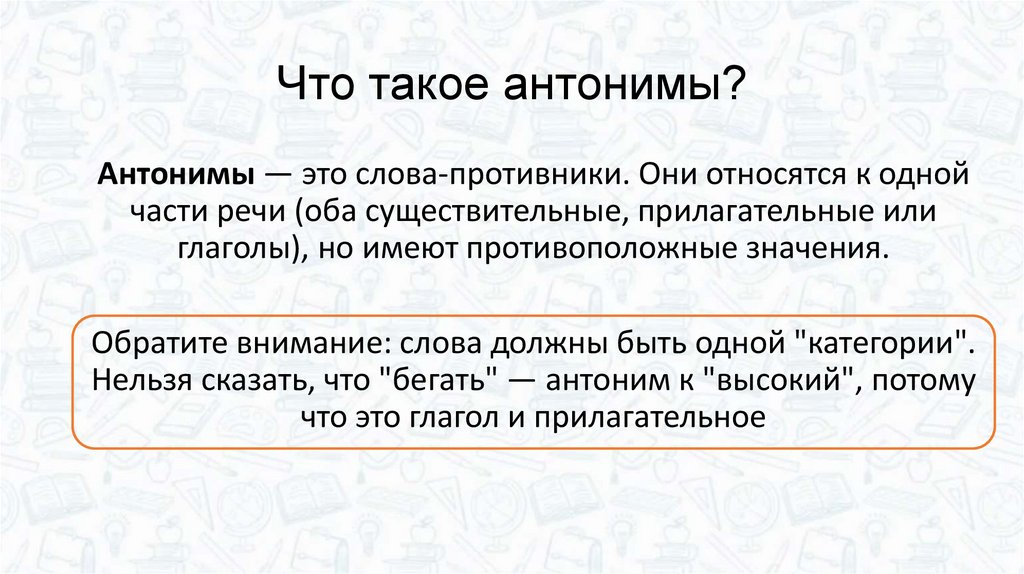 Антонимы — это слова-противники. Они относятся к однойчасти речи (оба существительные, прилагательные или