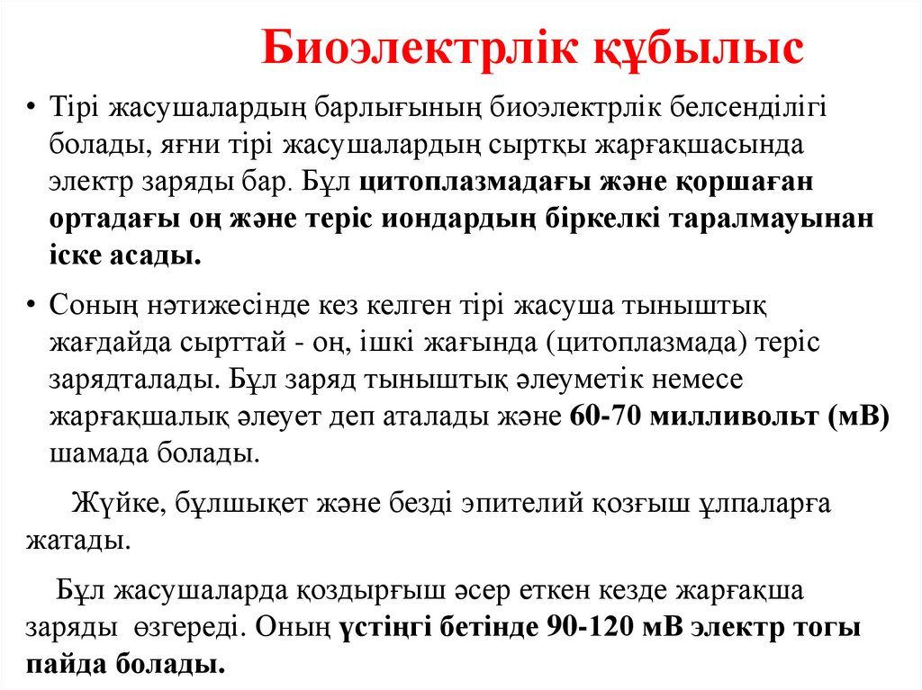 Биоэлектрлік құбылыс• Тірі жасушалардың барлығының биоэлектрлік белсенділігі