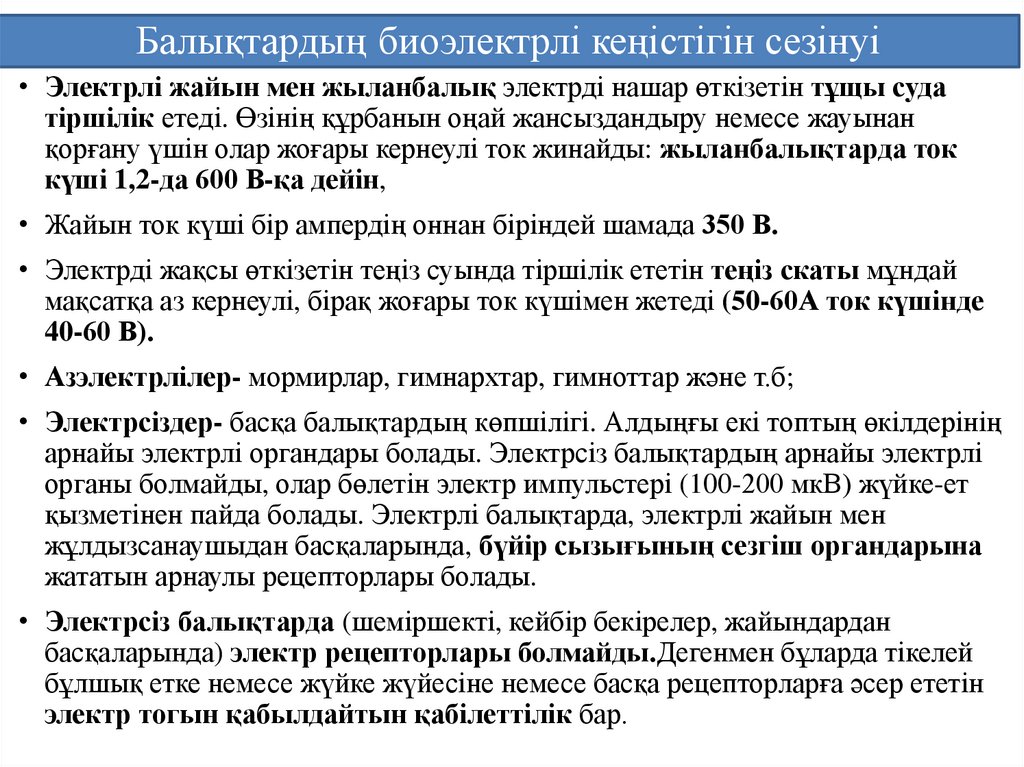 Балықтардың биоэлектрлі кеңістігін сезінуі• Электрлі жайын мен жыланбалық электрді нашар өткізетін тұщы суда