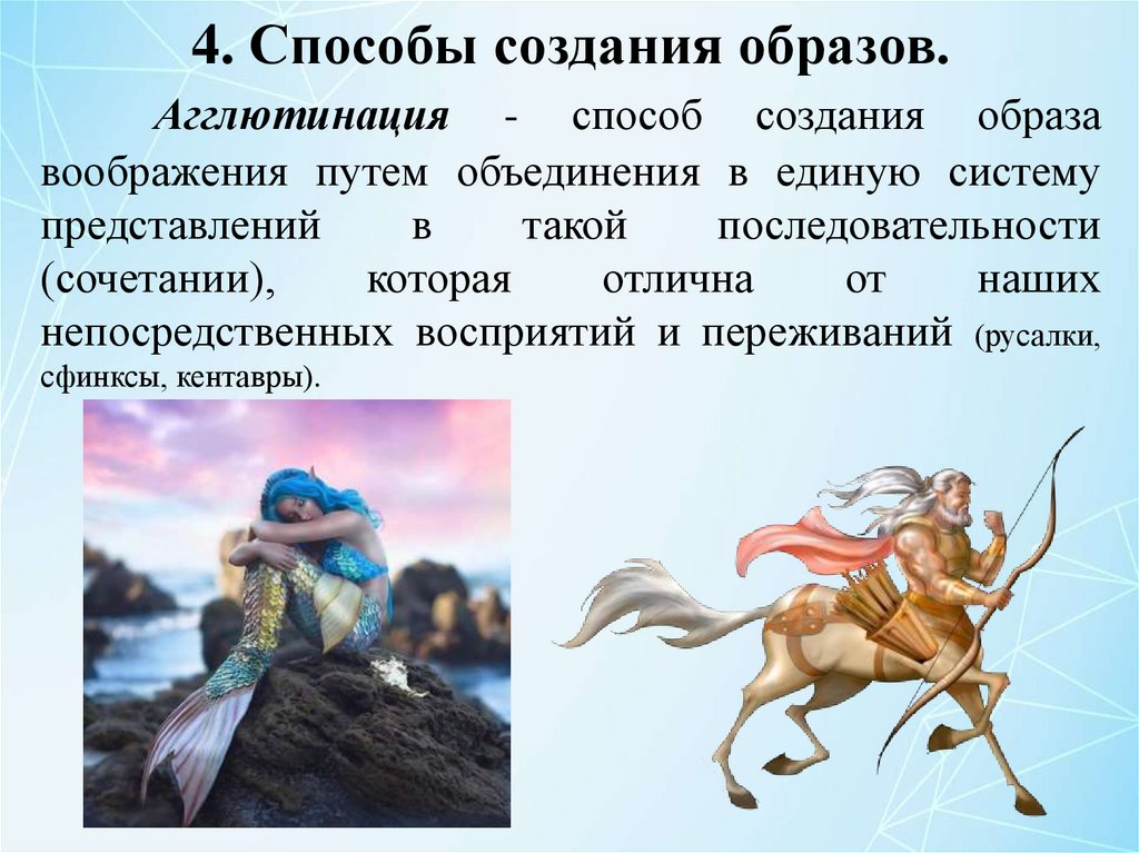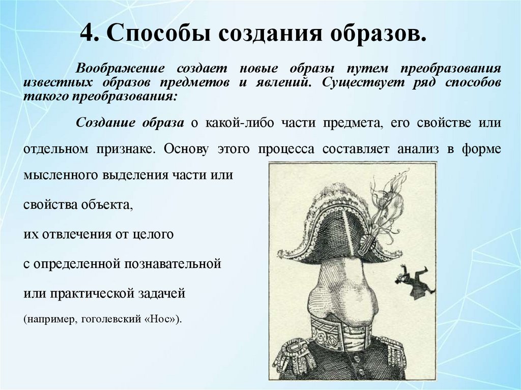 Воображение создает новые образы путем преобразованияизвестных образов предметов и явлений. Существует ряд способов