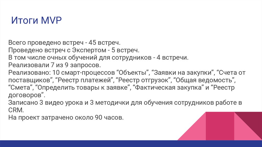Итоги MVPВсего проведено встреч - 45 встреч.