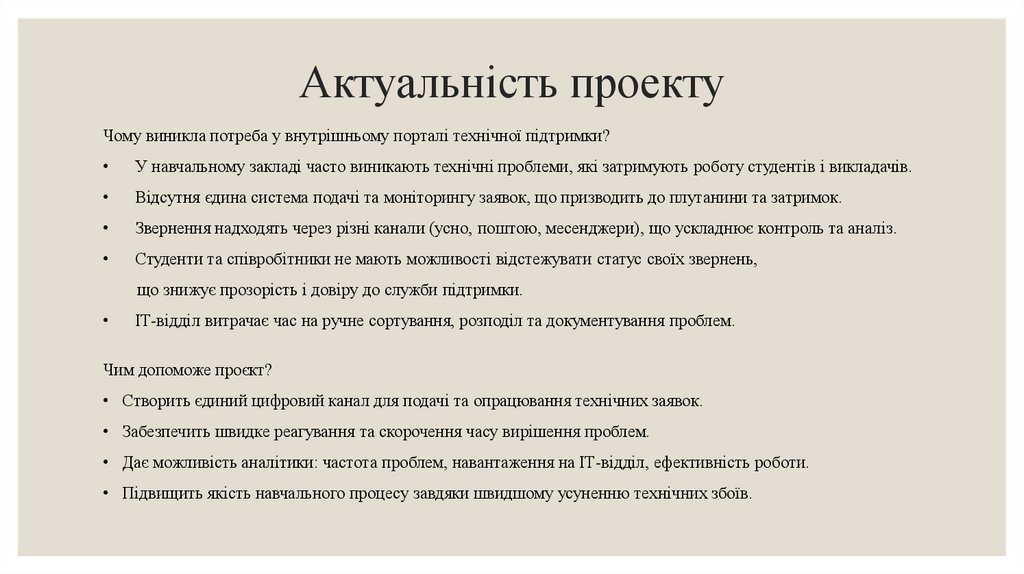 Чому виникла потреба у внутрішньому порталі технічної підтримки?У навчальному закладі часто виникають технічні проблеми, які затримують роботу студентів і викладачів.
