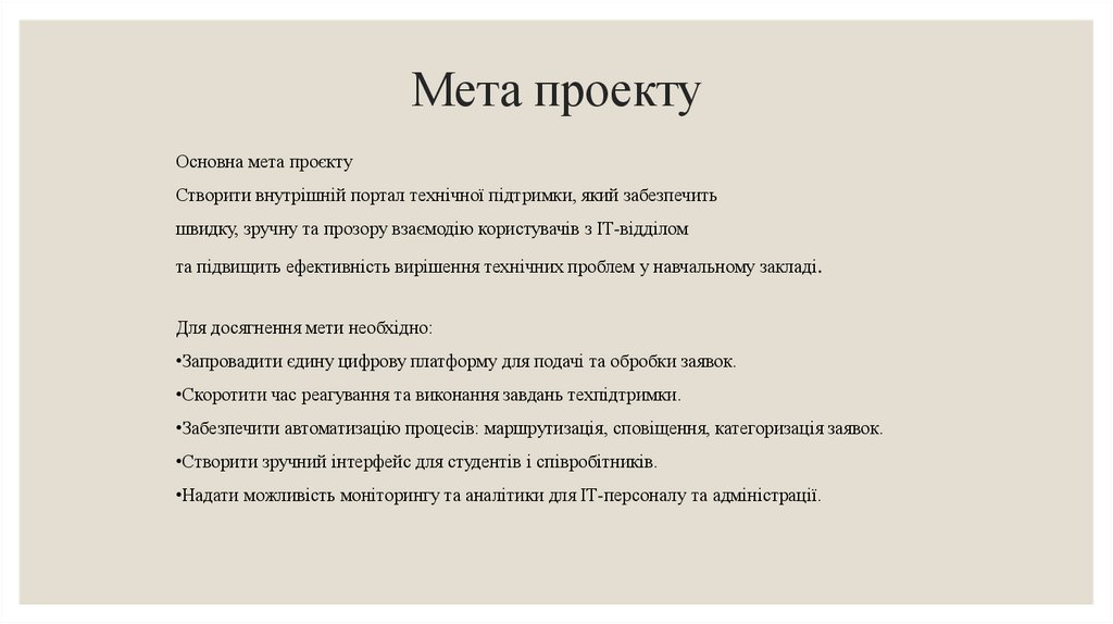 Основна мета проєктуСтворити внутрішній портал технічної підтримки, який забезпечить