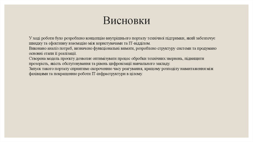 У ході роботи було розроблено концепцію внутрішнього порталу технічної підтримки, який забезпечуєшвидку та ефективну взаємодію між користувачами та ІТ-відділом.