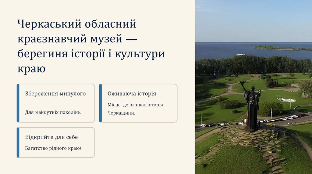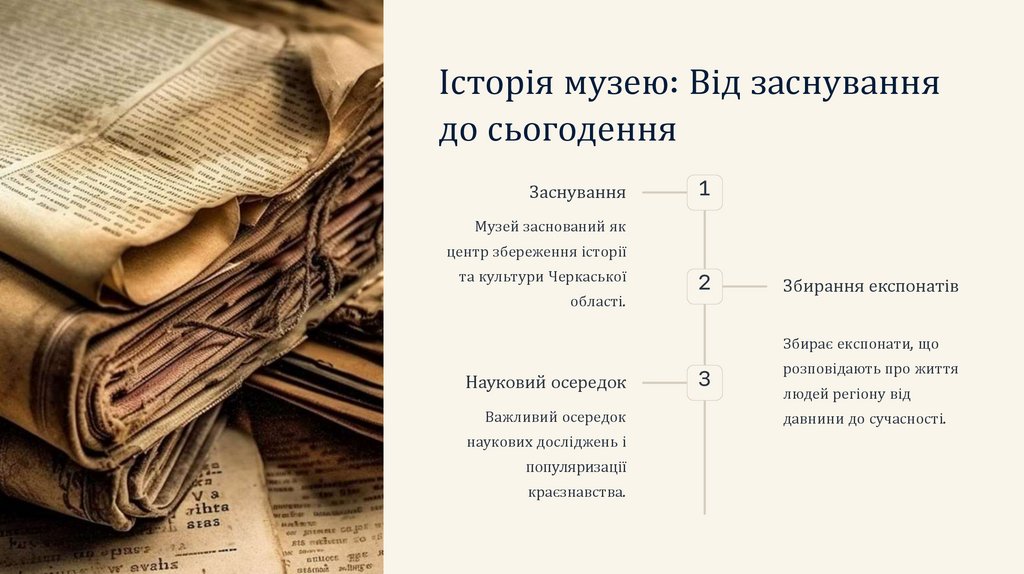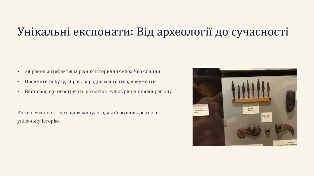 Унікальні експонати: Від археології до сучасностіЗібрання артефактів із різних історичних епох Черкащини