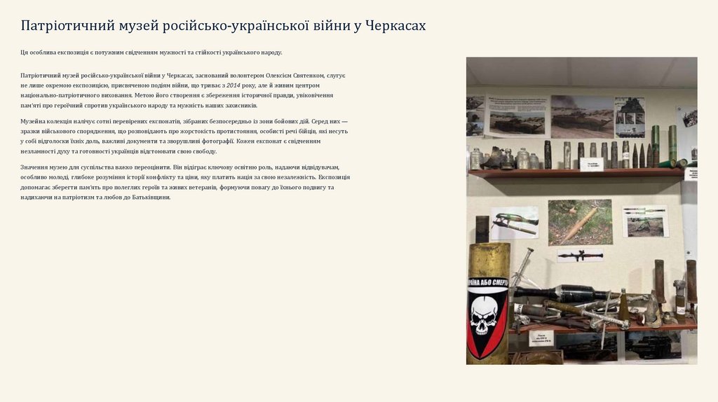Патріотичний музей російсько-української війни у ЧеркасахЦя особлива експозиція є потужним свідченням мужності та стійкості українського народу.