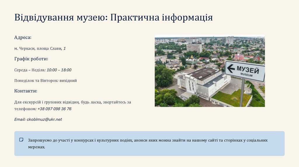 Для екскурсій і групових відвідин, будь ласка, звертайтесь за