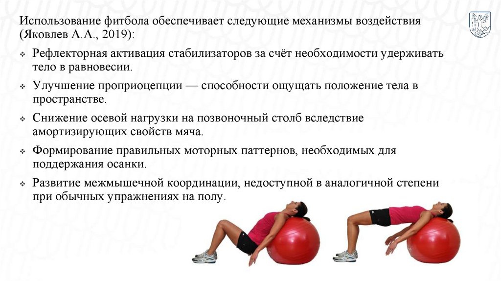 Использование фитбола обеспечивает следующие механизмы воздействия(Яковлев А.А., 2019):