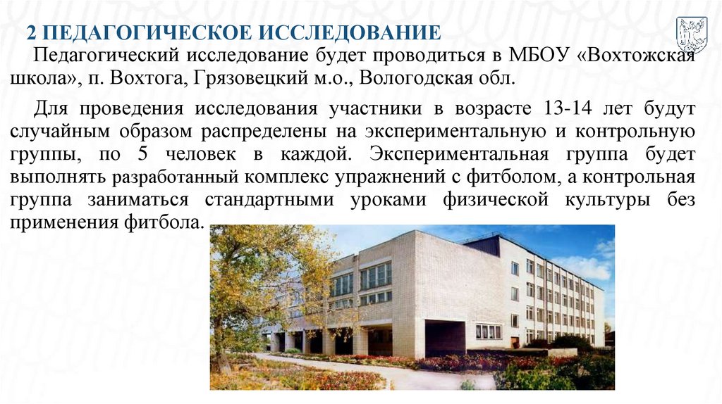 Педагогический исследование будет проводиться в МБОУ «Вохтожскаяшкола», п. Вохтога, Грязовецкий м.о., Вологодская обл.