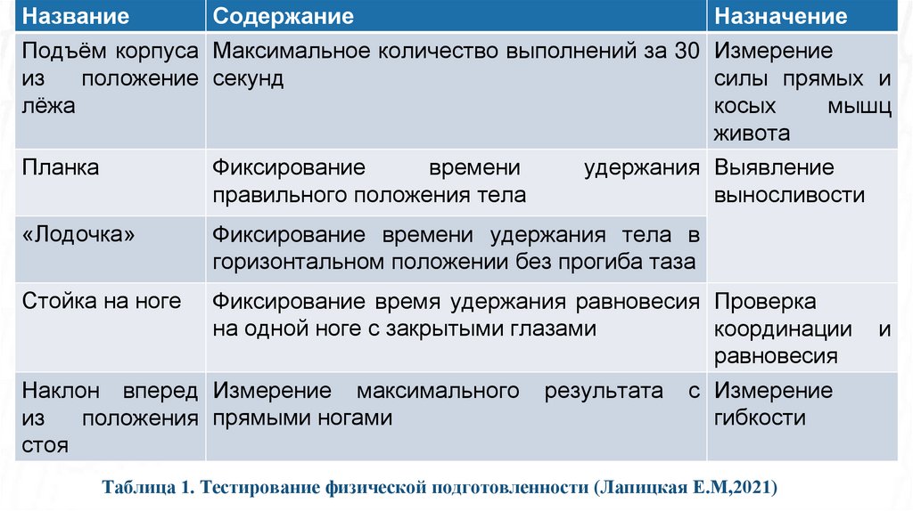 Таблица 1. Тестирование физической подготовленности (Лапицкая Е.М,2021)