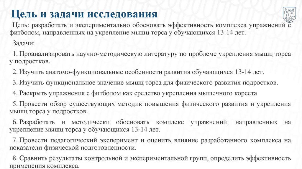 Цель: разработать и экспериментально обосновать эффективность комплекса упражнений сфитболом, направленных на укрепление мышц торса у обучающихся 13-14 лет.