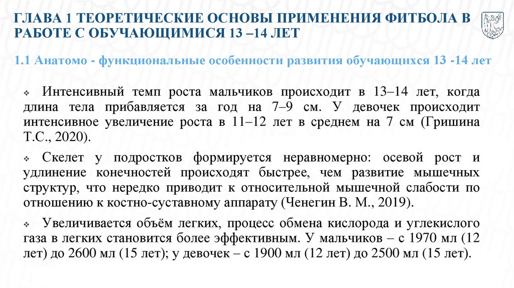 1.1 Анатомо - функциональные особенности развития обучающихся 13 -14 летИнтенсивный темп роста мальчиков происходит в 13–14 лет, когда