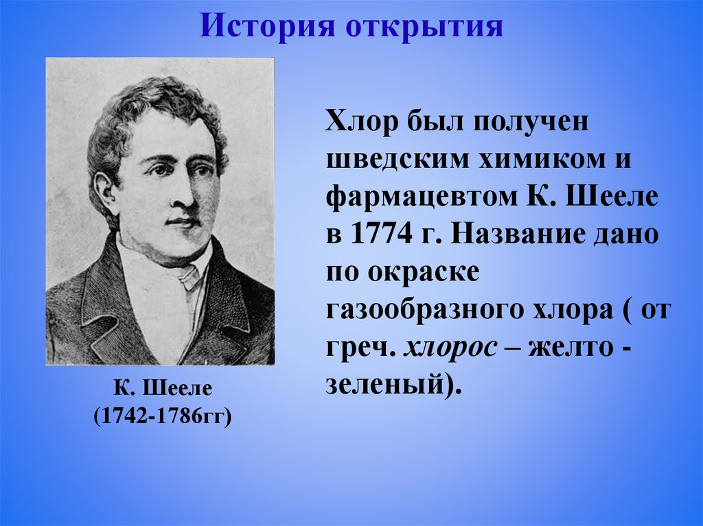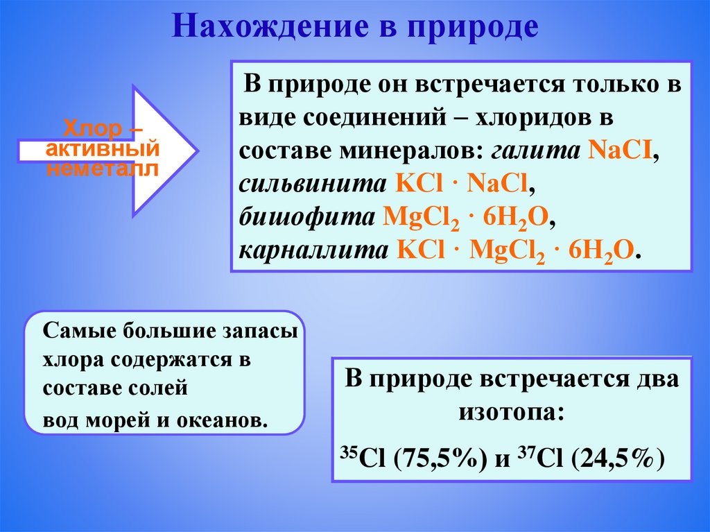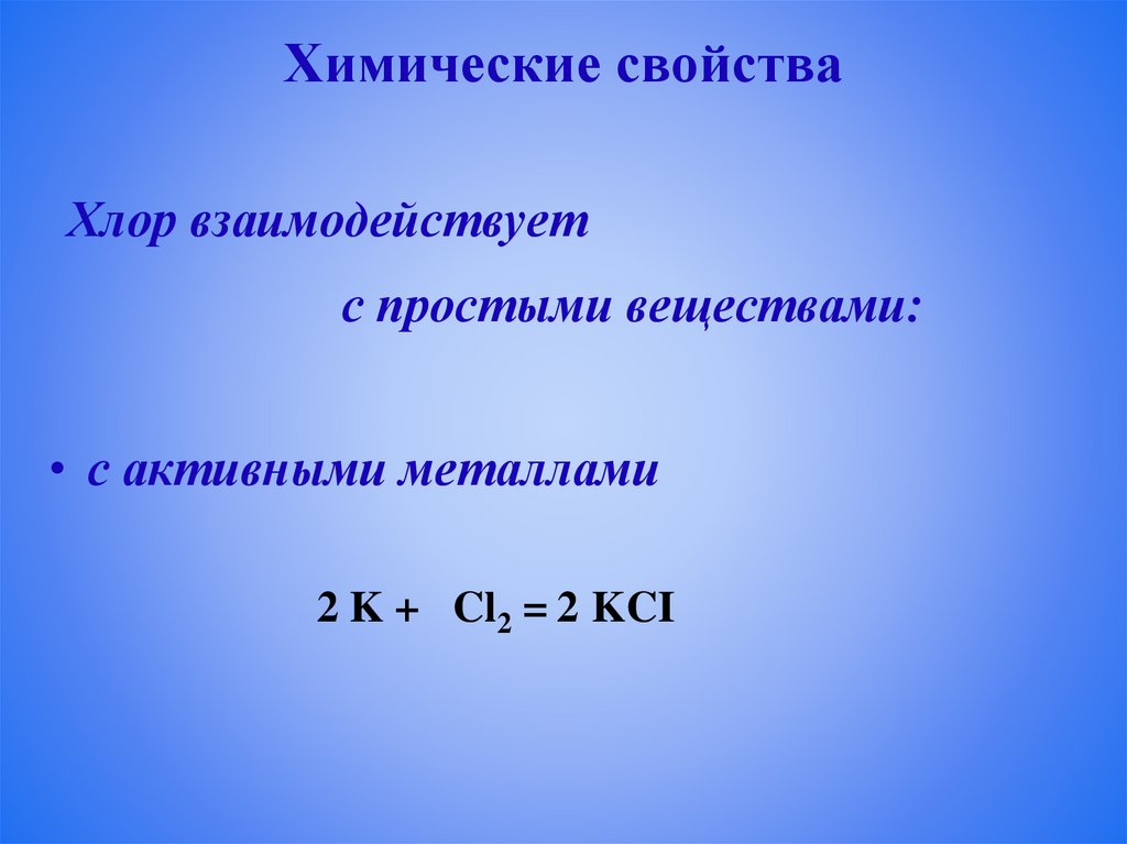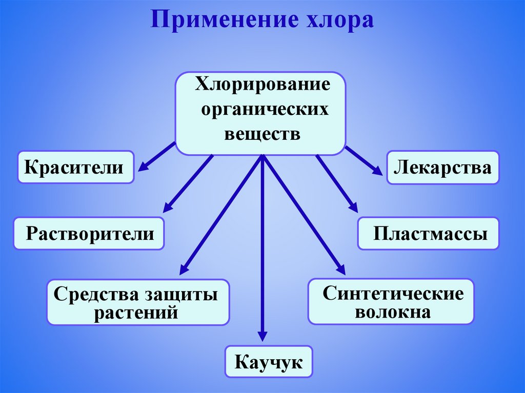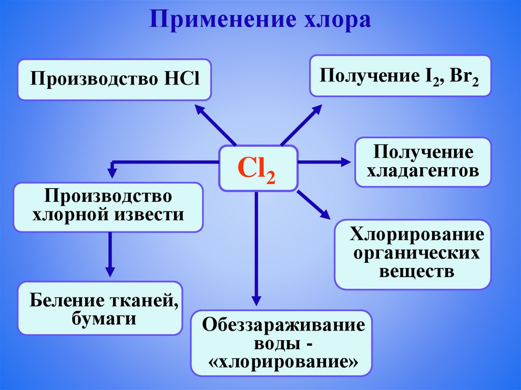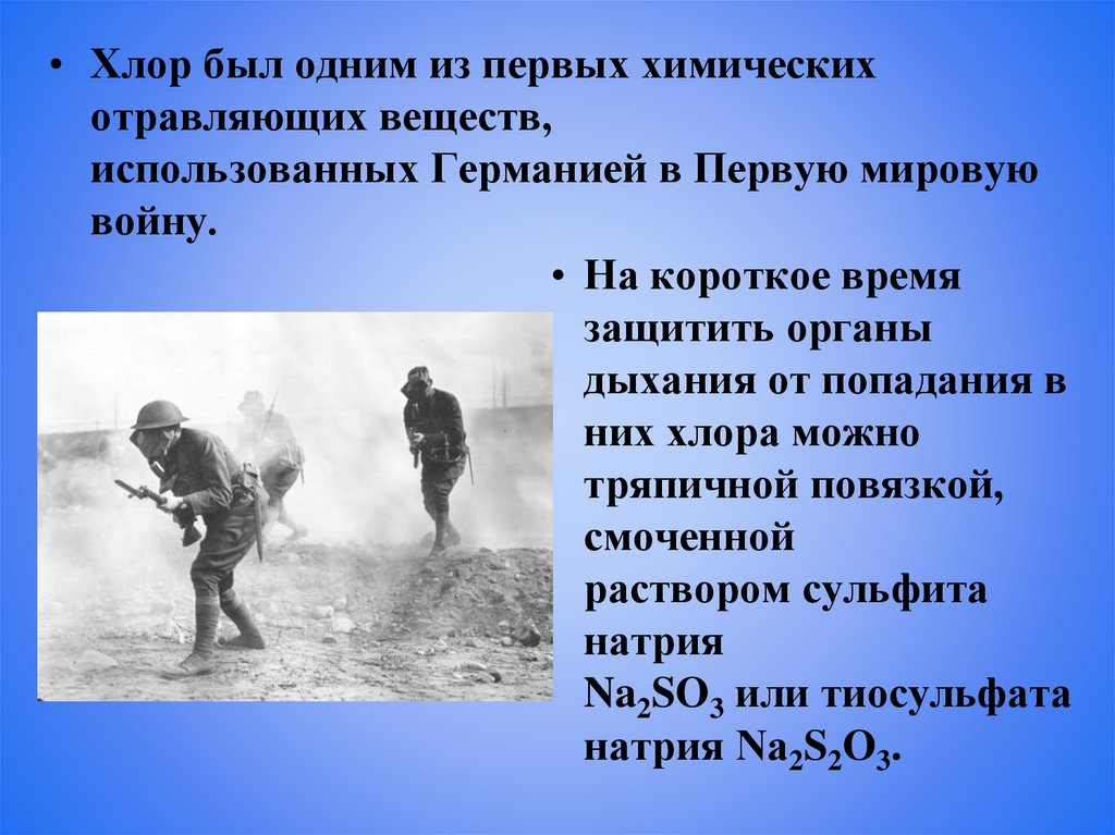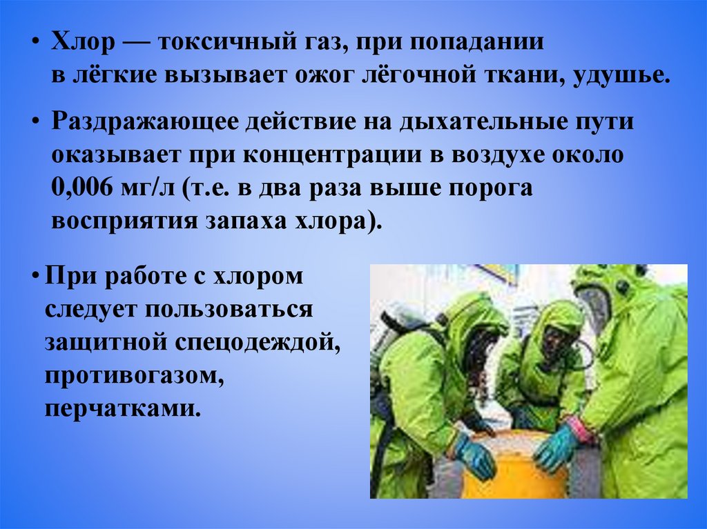 • Хлор — токсичный газ, при попаданиив лёгкие вызывает ожог лёгочной ткани, удушье.
