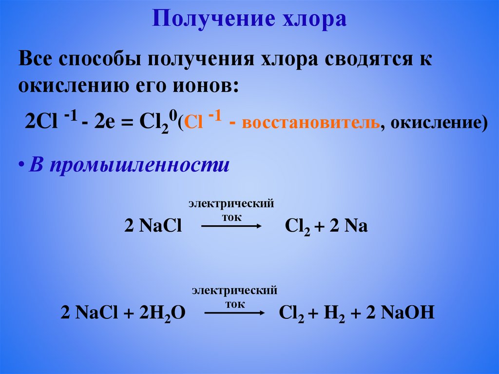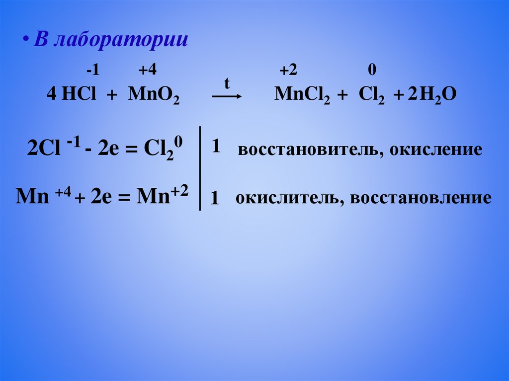 2Cl -1 - 2e = Cl20(Cl -1 - восстановитель, окисление)