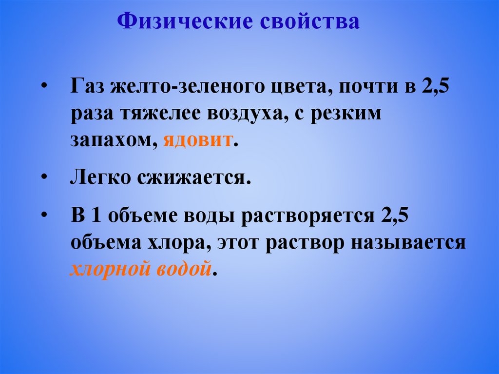 Физические свойства• Газ желто-зеленого цвета, почти в 2,5