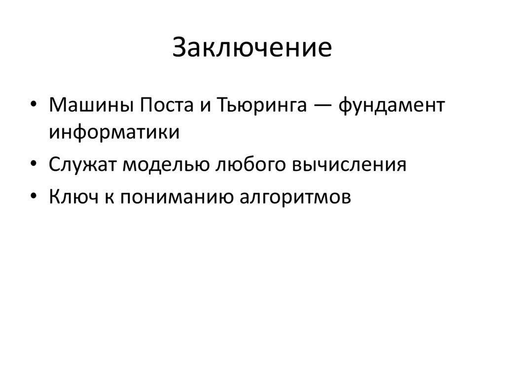 Заключение• Машины Поста и Тьюринга — фундамент