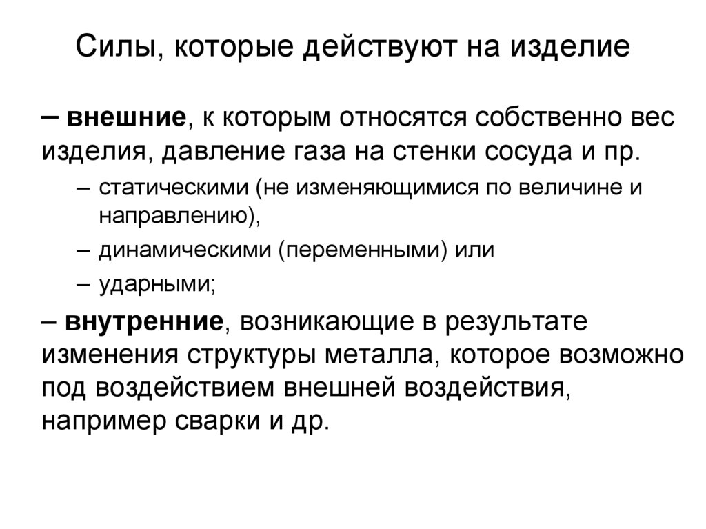 – внешние, к которым относятся собственно весизделия, давление газа на стенки сосуда и пр.