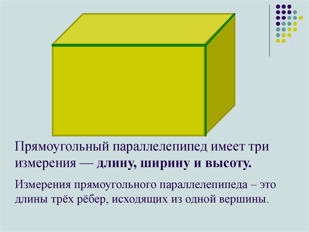 Прямоугольный параллелепипед имеет триизмерения — длину, ширину и высоту.