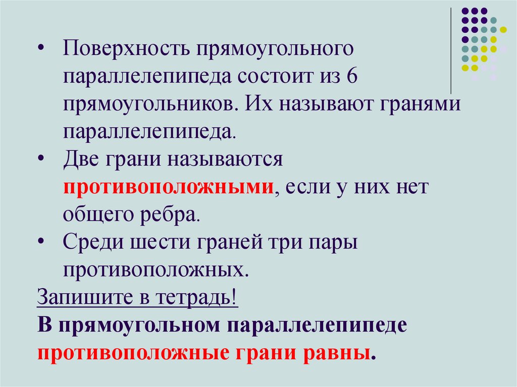 • Поверхность прямоугольногопараллелепипеда состоит из 6