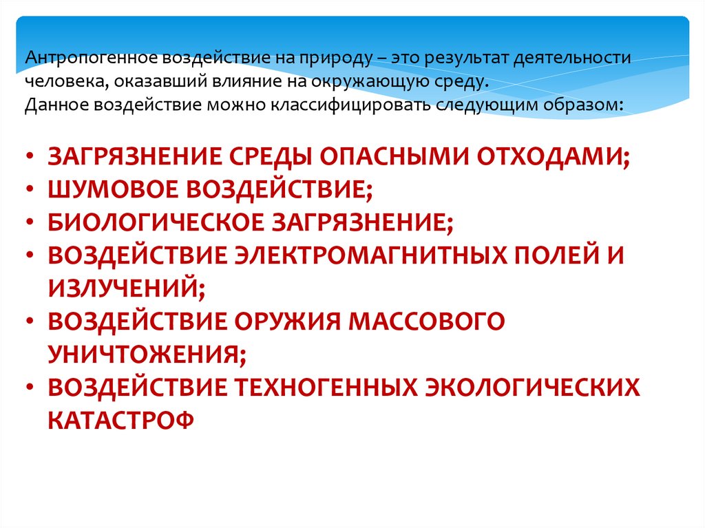 Антропогенное воздействие на природу – это результат деятельностичеловека, оказавший влияние на окружающую среду.