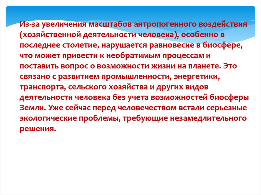 Из-за увеличения масштабов антропогенного воздействия(хозяйственной деятельности человека), особенно в