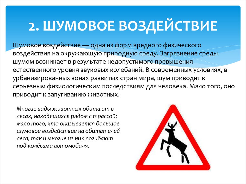 Шумовое воздействие — одна из форм вредного физическоговоздействия на окружающую природную среду. Загрязнение среды