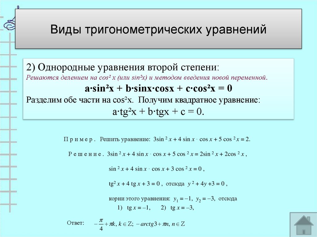 2) Однородные уравнения второй степени:Решаются делением на cos² х (или sin²x) и методом введения новой переменной.