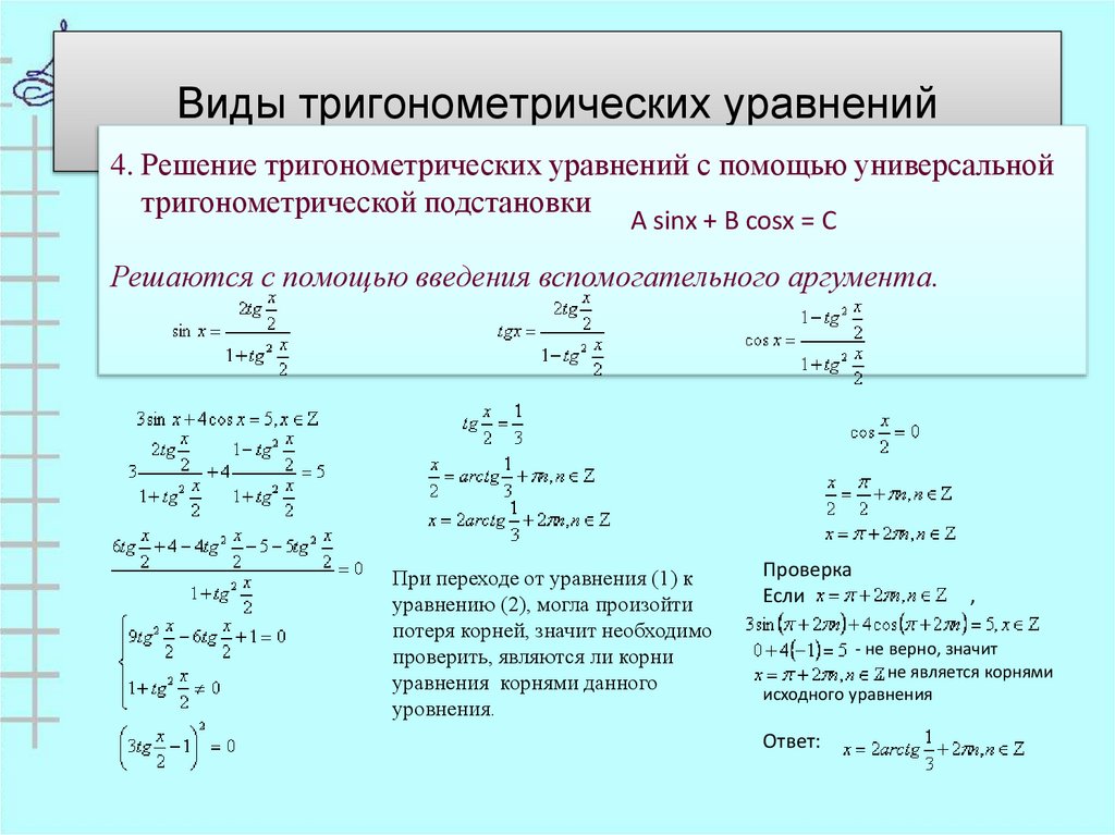 4. Решение тригонометрических уравнений с помощью универсальнойтригонометрической подстановки