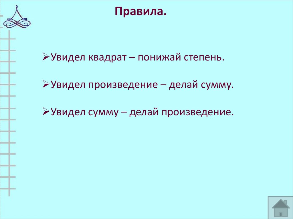 Правила.Увидел квадрат – понижай степень.