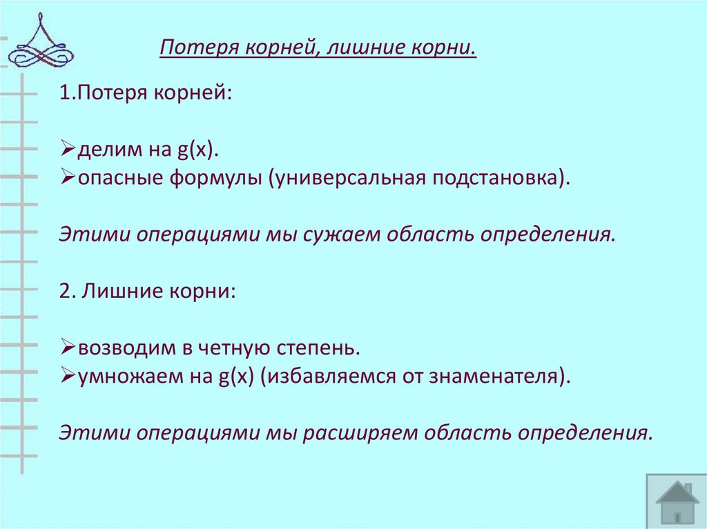 Потеря корней, лишние корни.1.Потеря корней: