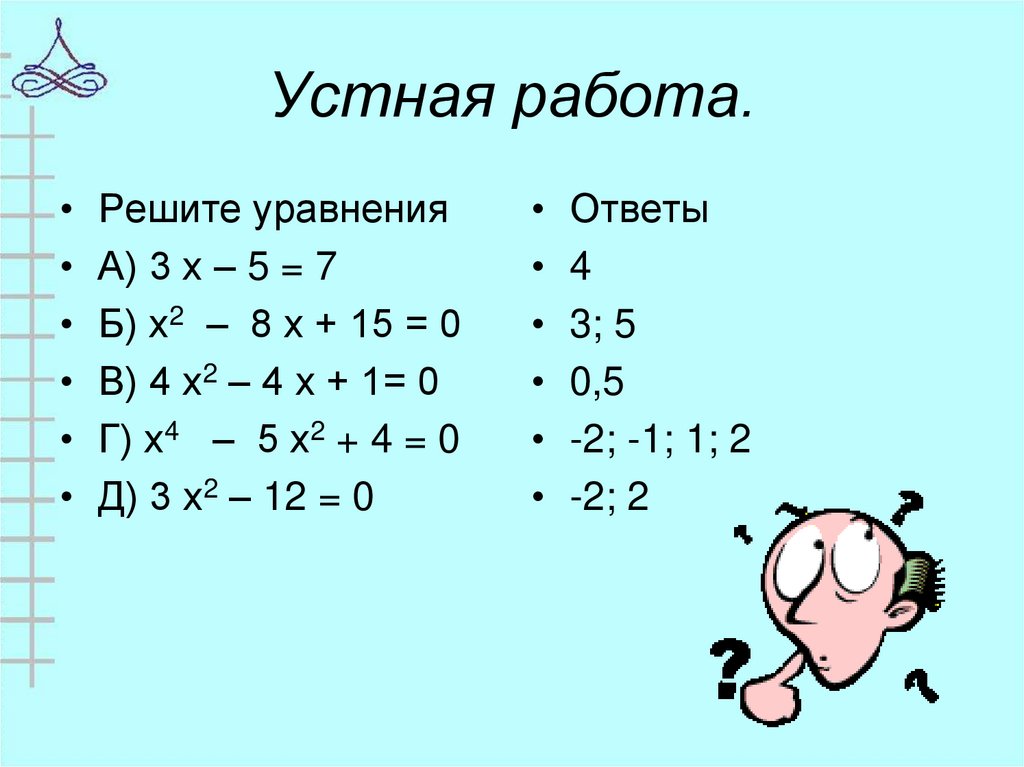 • Г) х4 – 5 х2 + 4 = 0