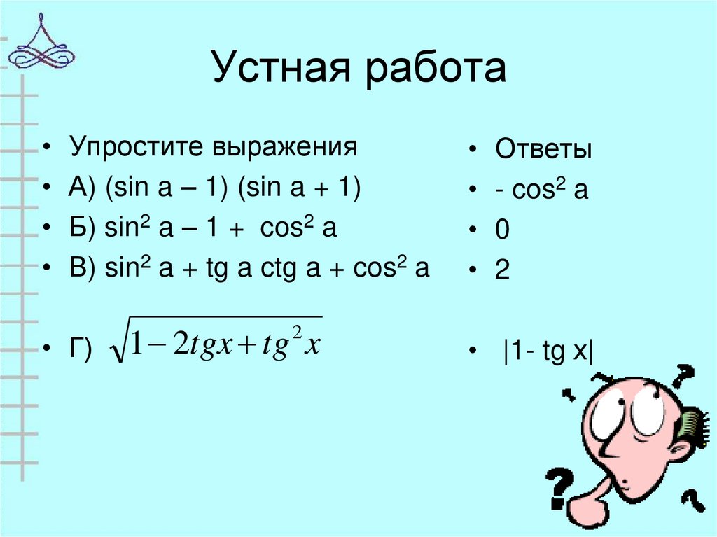 • Упростите выражения• А) (sin a – 1) (sin a + 1)