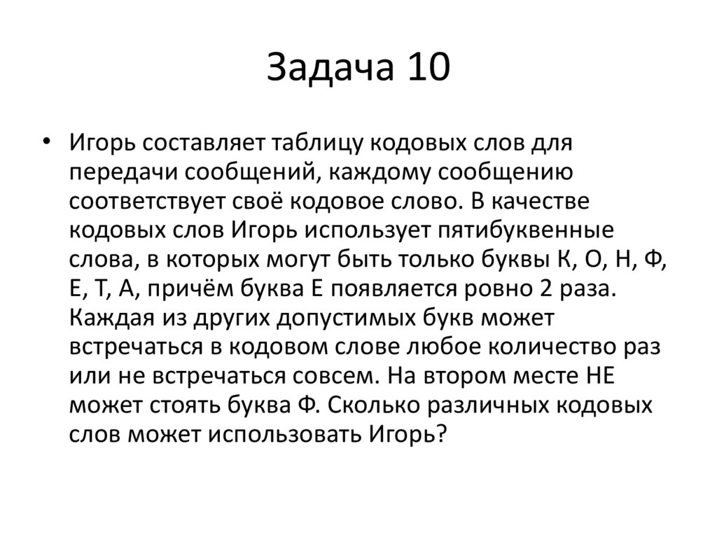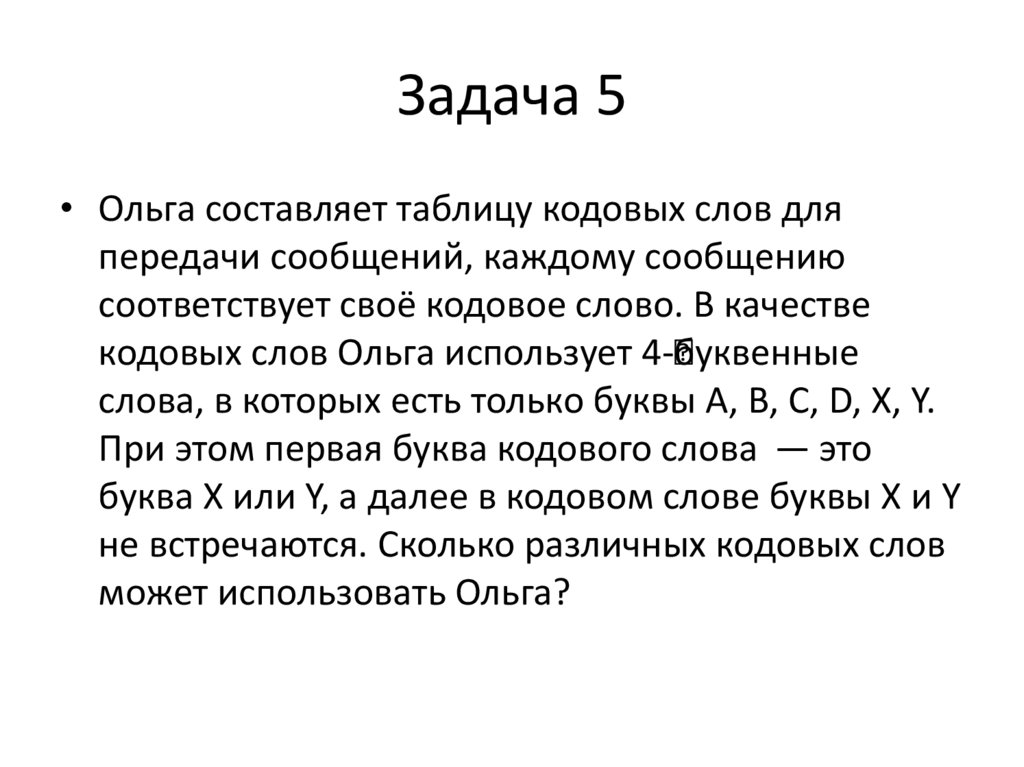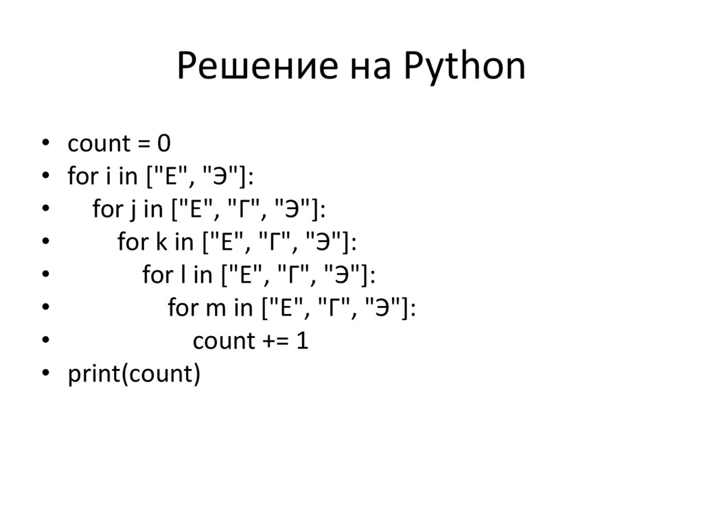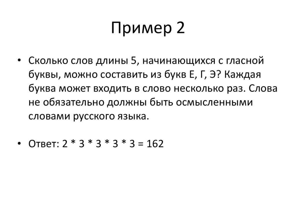 • Сколько слов длины 5, начинающихся с гласнойбуквы, можно составить из букв Е, Г, Э? Каждая