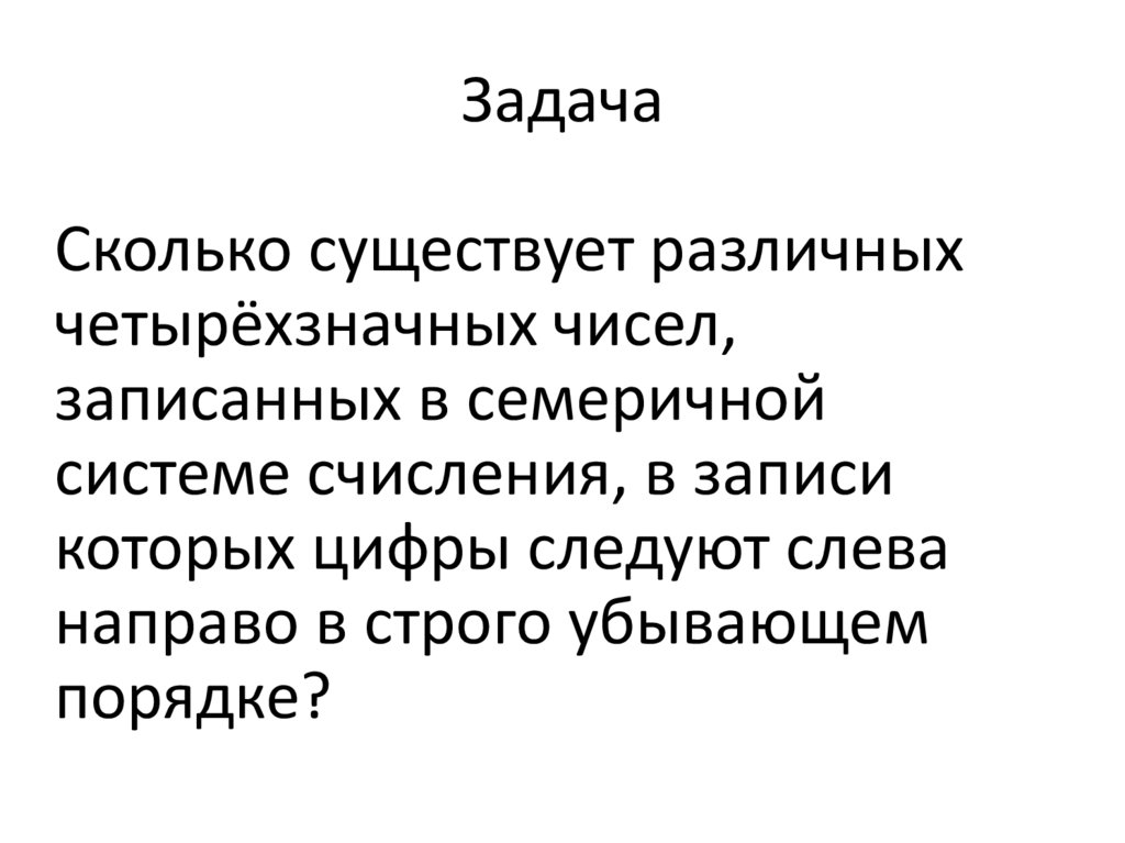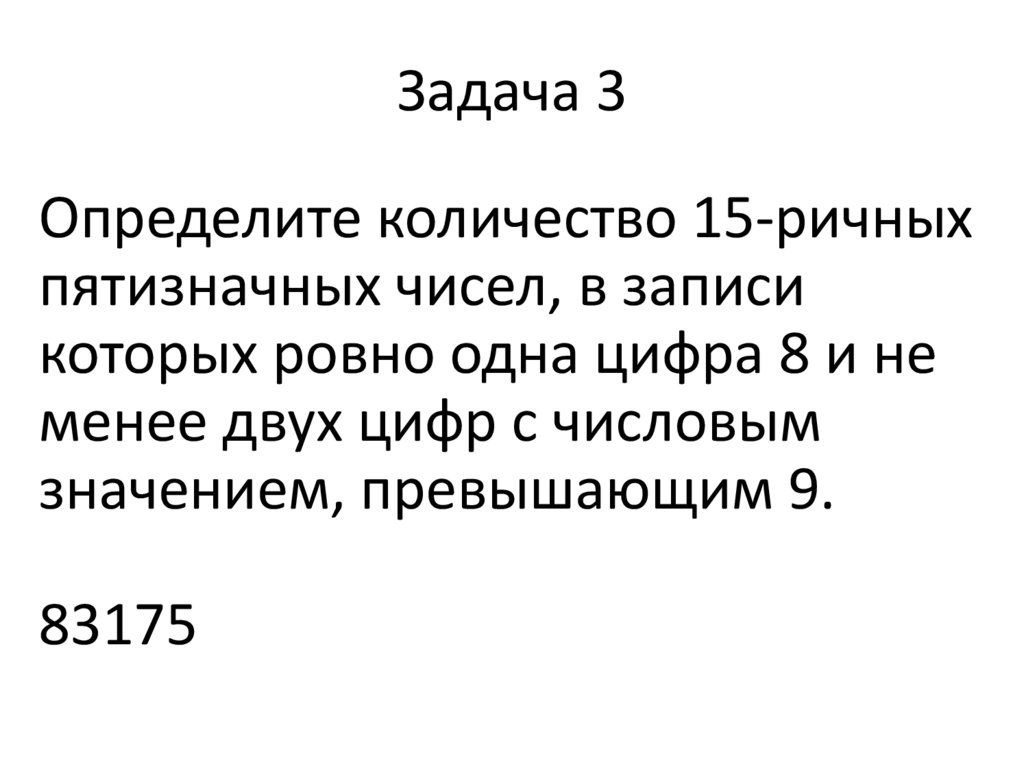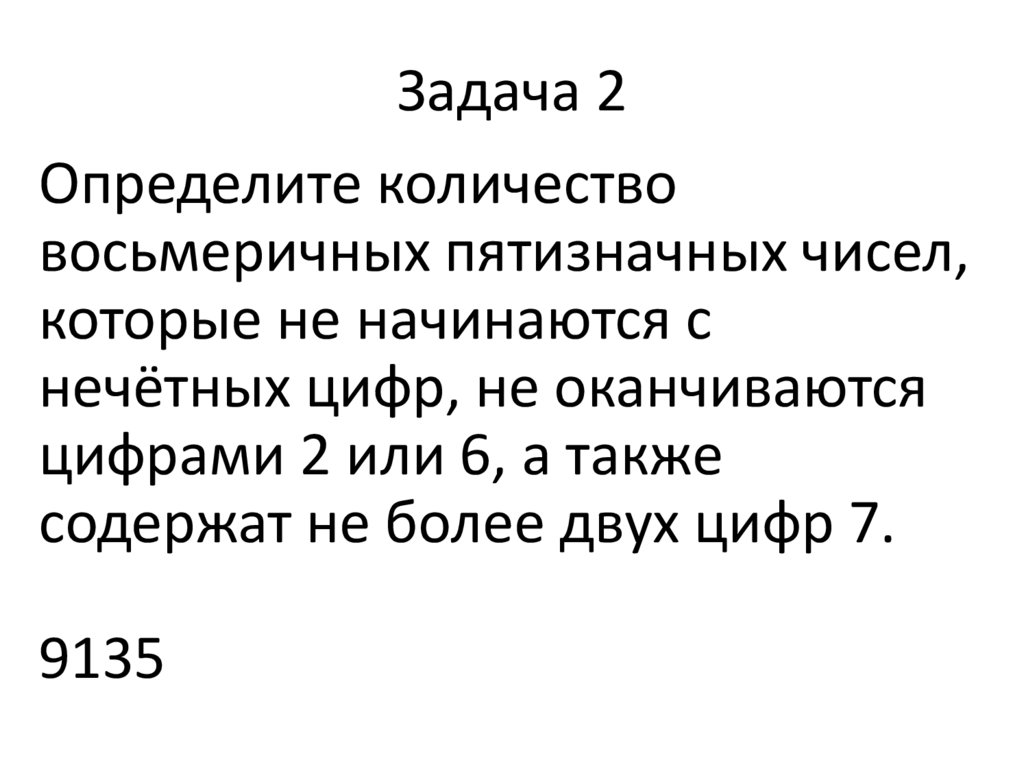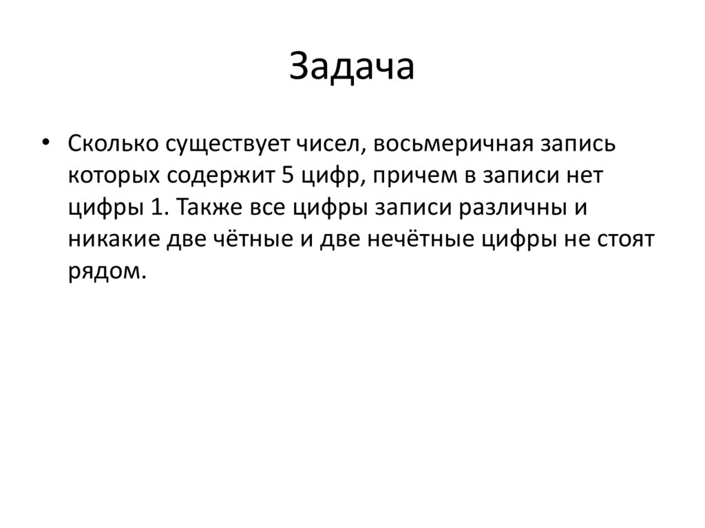 • Сколько существует чисел, восьмеричная записькоторых содержит 5 цифр, причем в записи нет