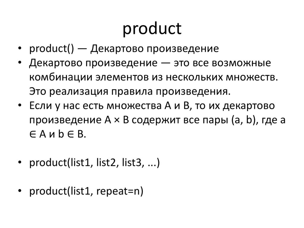 • product() — Декартово произведение• Декартово произведение — это все возможные