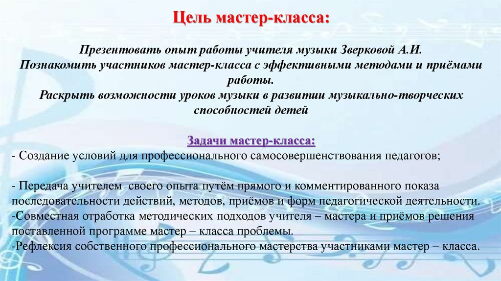 Цель мастер-класса:Презентовать опыт работы учителя музыки Зверковой А.И.