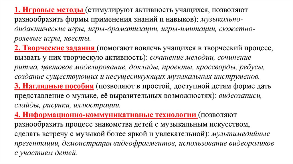 1. Игровые методы (стимулируют активность учащихся, позволяютразнообразить формы применения знаний и навыков): музыкальнодидактические игры, игры-драматизации, игры-имитации, сюжетноролевые игры, квесты.