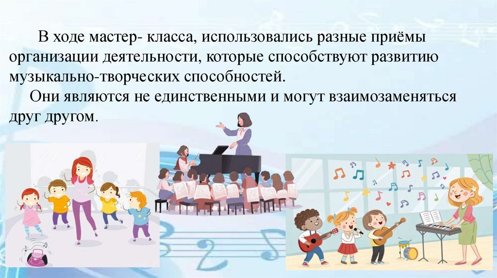 В ходе мастер- класса, использовались разные приёмыорганизации деятельности, которые способствуют развитию
