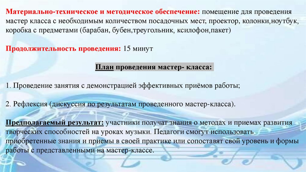Материально-техническое и методическое обеспечение: помещение для проведениямастер класса с необходимым количеством посадочных мест, проектор, колонки,ноутбук,
