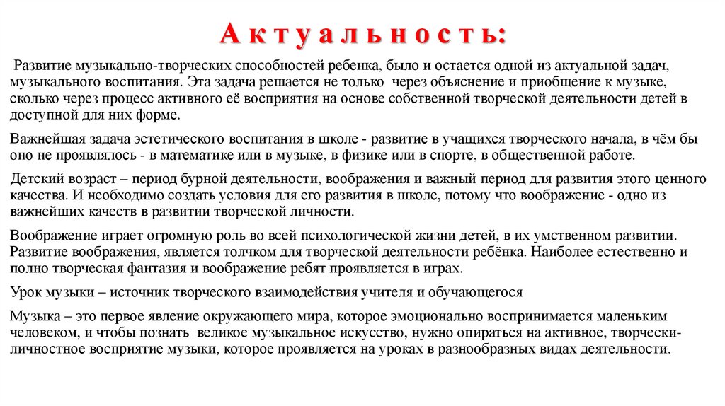 А к т у а л ь н о с т ь:Развитие музыкально-творческих способностей ребенка, было и остается одной из актуальной задач,