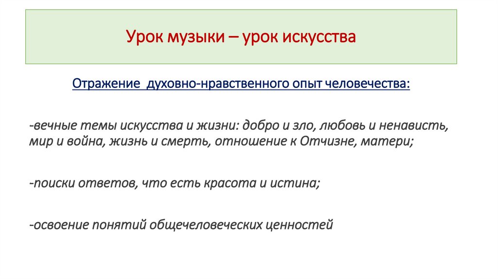 Урок музыки – урок искусстваОтражение духовно-нравственного опыт человечества: