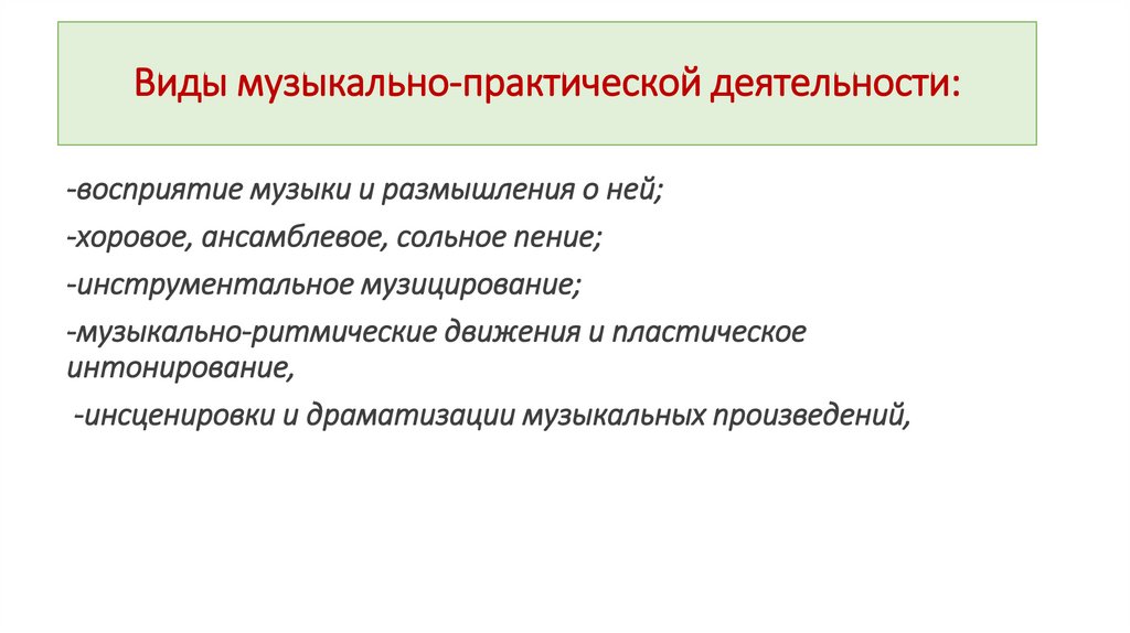Виды музыкально-практической деятельности:-восприятие музыки и размышления о ней;