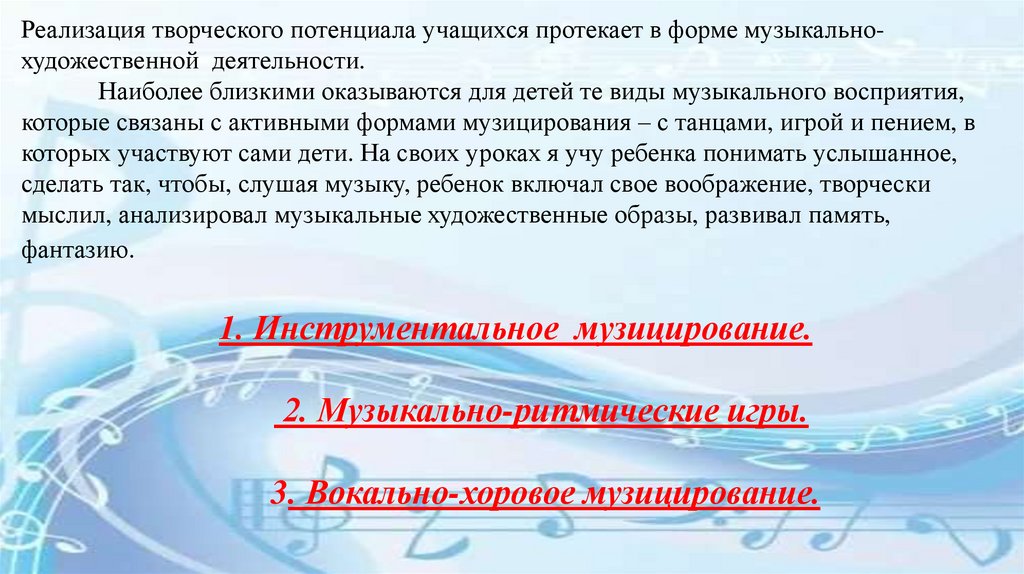 Реализация творческого потенциала учащихся протекает в форме музыкальнохудожественной деятельности.Наиболее близкими оказываются для детей те виды музыкального восприятия,