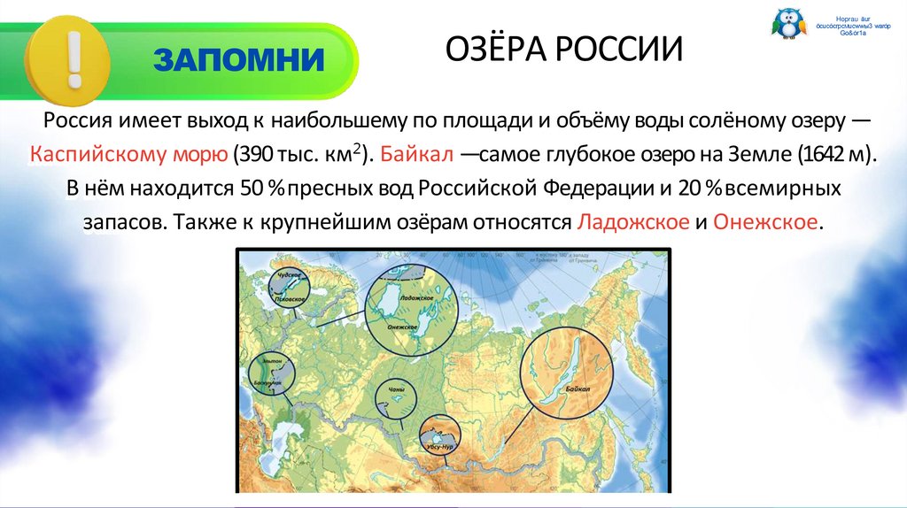 В нём находится 50 %пресных вод Российской Федерации и 20 %всемирных