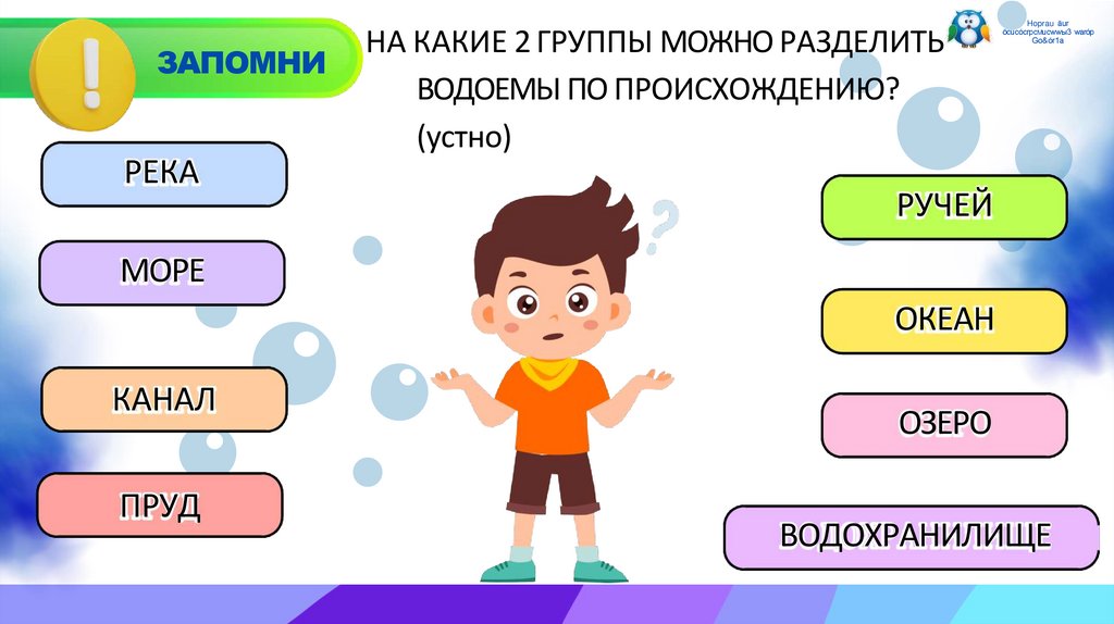 3. НА КАКИЕ 2 ГРУППЫ МОЖНО РАЗДЕЛИТЬ ВОДОЕМЫ ПО ПРОИСХОЖДЕНИЮ? (устно)
