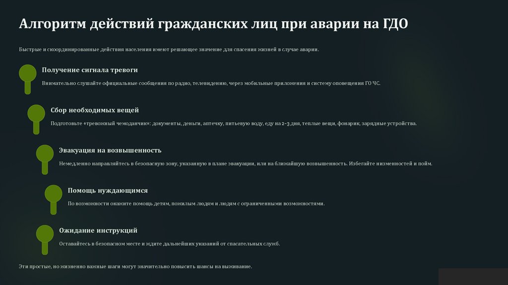 Алгоритм действий гражданских лиц при аварии на ГДОБыстрые и скоординированные действия населения имеют решающее значение для спасения жизней в случае аварии.